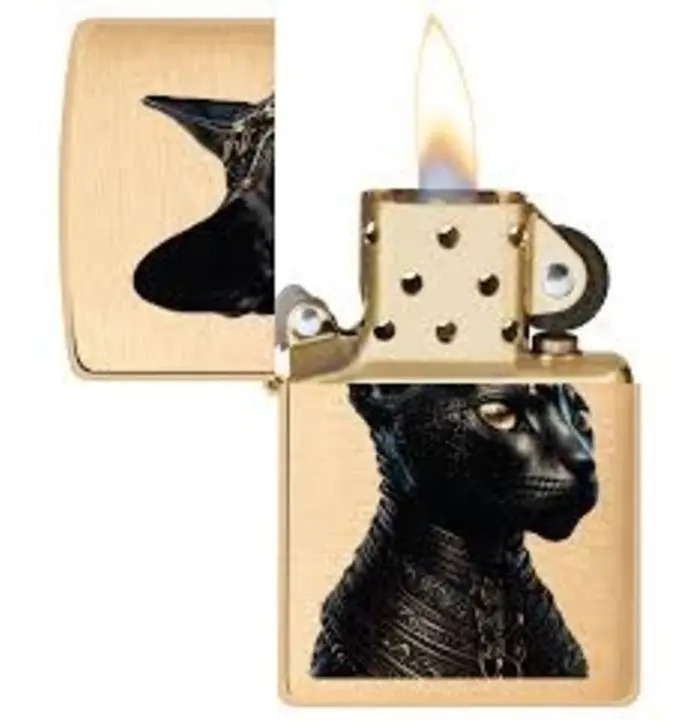 The Egyptian goddess Bastet takes shape as a majestic feline on this classic Brushed Brass lighter in a regal colour Image design.