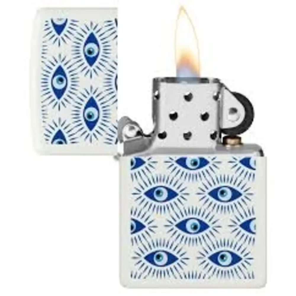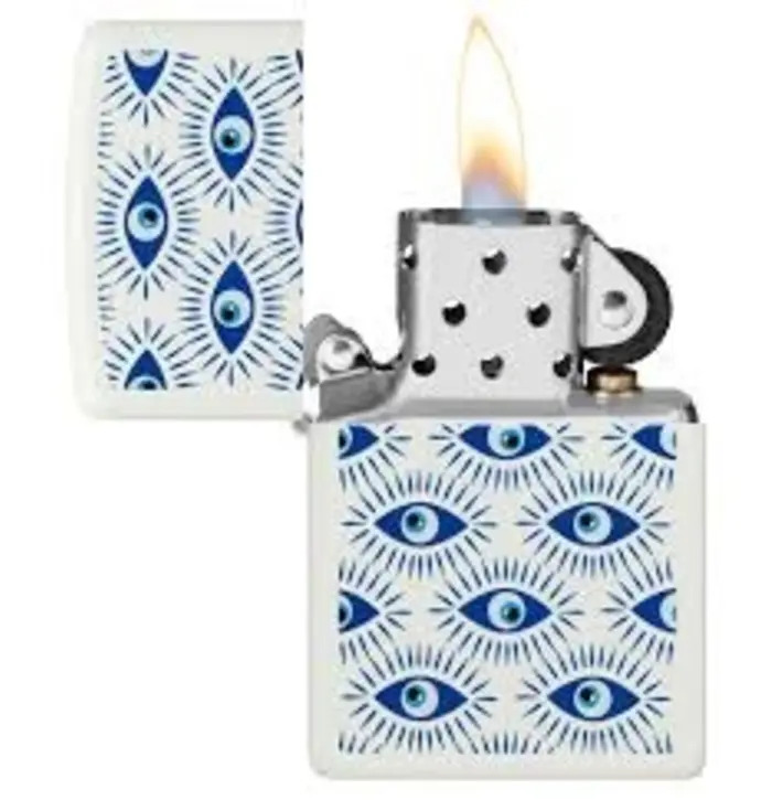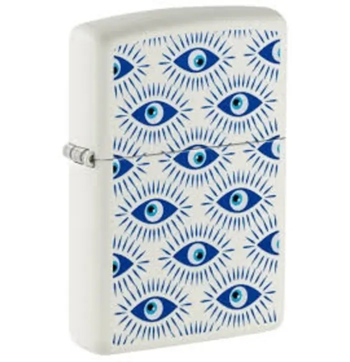 Defend yourself from evil forces with this classic White Matte lighter. The bright Colour Image design features a repetition of the Evil Eye, which is seen across many cultures as a symbol of protection against bad omens.