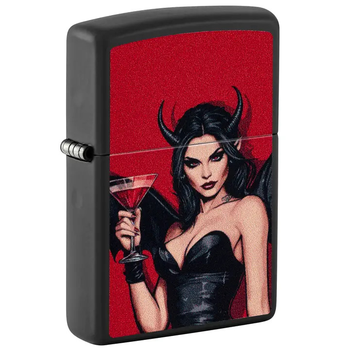 while holding a blood martini, a demonic vampire shows off her burning red eyes on the face of this sleek matte back lighter in a alluring Colourfull Image design.
