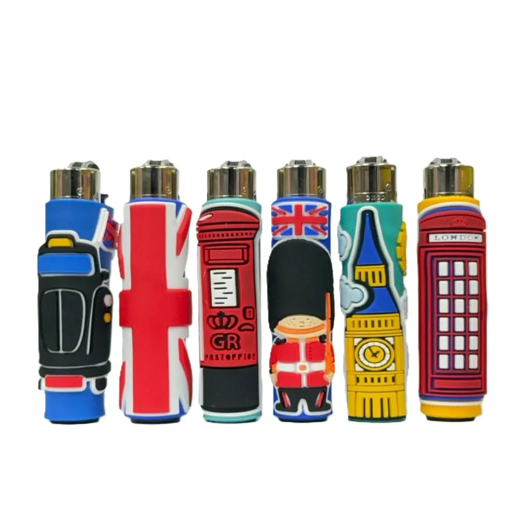 Bring a bit of London flair to your pocket with these Clipper lighters featuring 3D rubber London-themed sleeves. Each lighter is wrapped in a soft, textured rubber case showing iconic UK imagery like the Union Jack flag, red post box, royal guard, Big Ben, and classic red telephone box.