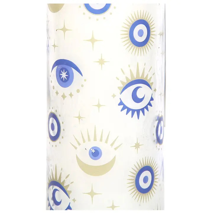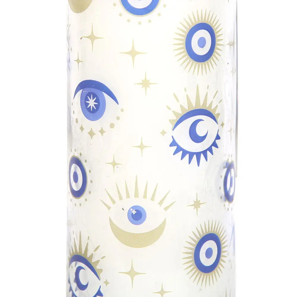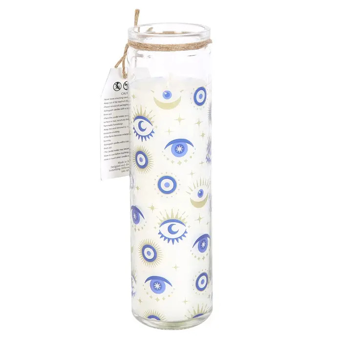 This White Sage Scented Candle is designed to bring spiritual clarity, cleansing, and protection into your space. Encased in a tall glass jar decorated with mystical evil eye and moon symbols, it offers a calming, protective aesthetic perfect for meditation corners, altars, or everyday home décor. The soothing white sage fragrance helps clear negative energy and promote balance and peace. Finished with a rustic twine tie and blue intention tag, this candle makes a meaningful gift for anyone seeking spiritual grounding, energy cleansing, or a beautifully scented ritual candle.