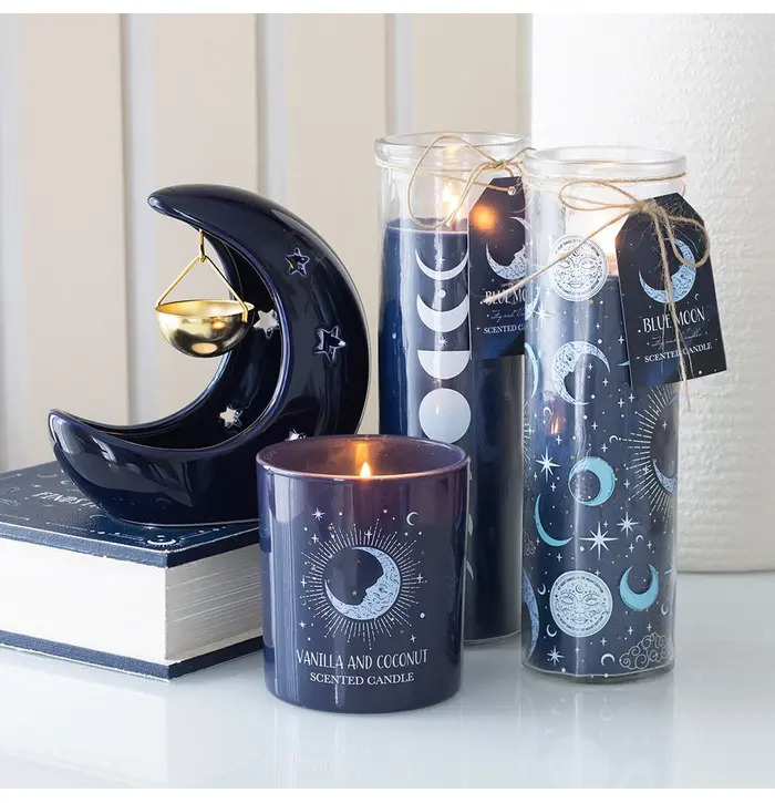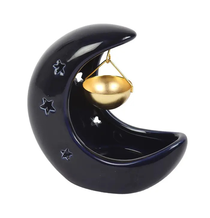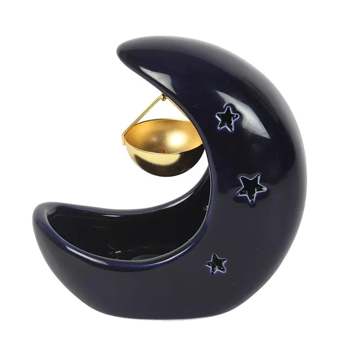 Bring celestial magic into your home with this stunning crescent moon oil burner. Crafted in a glossy midnight-blue ceramic, the moon shape features delicate star cut-outs that glow beautifully when a tealight is lit. A golden hanging bowl sits suspended at the centre, gently warming your favourite essential oils or wax melts for a soothing, aromatic experience.