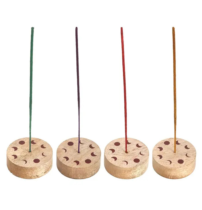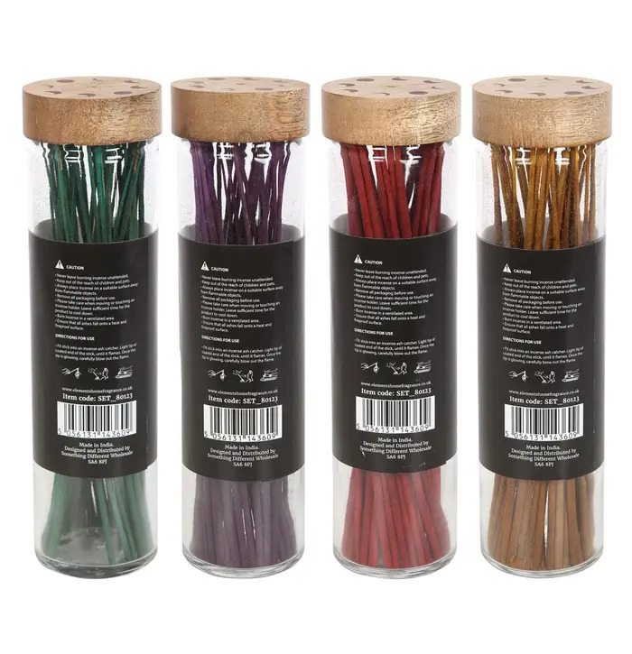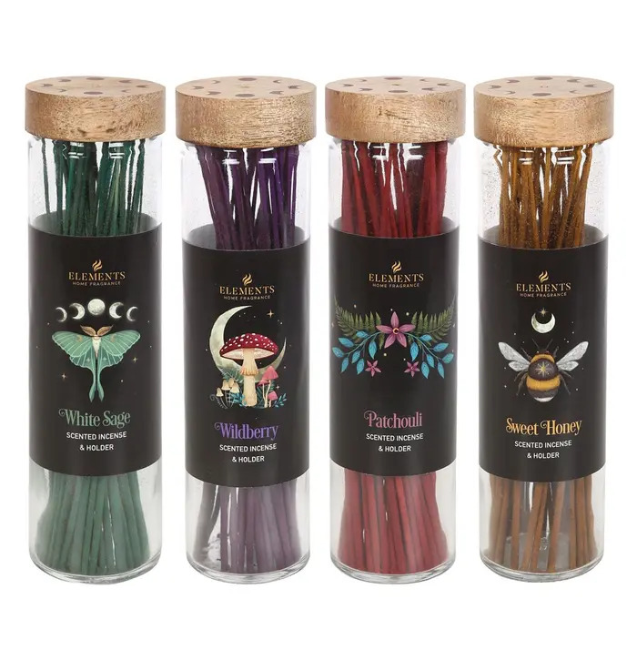 This Elements Home Fragrance incense range features four captivating scent options—White Sage, Wildberry, Patchouli, and Sweet Honey—sold individually. Each fragrance is packaged in a sleek cylindrical jar with a natural wooden lid that doubles as a built-in incense holder, offering both convenience and style. The artwork on each label reflects its scent profile, bringing a mystical and nature-inspired aesthetic to your space. Ideal for meditation, ritual use, home fragrance enhancement, or mindful gifting. This is for 1 scent chosen at random.