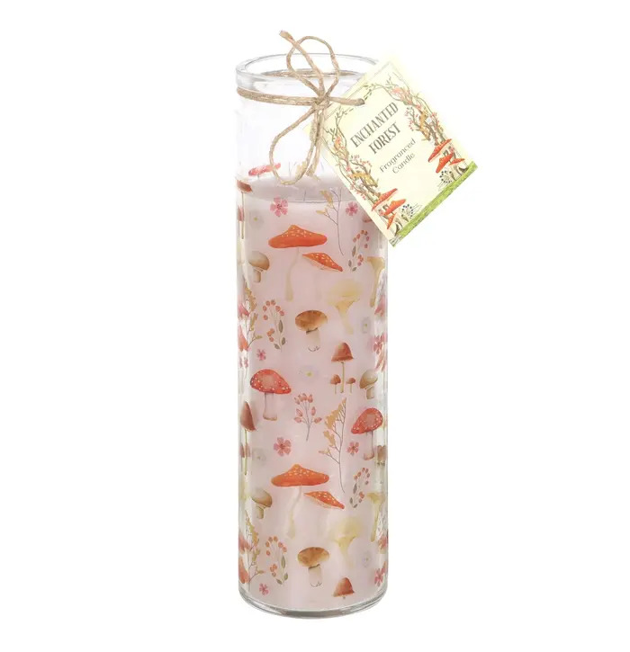 This tall botanical-inspired candle features a whimsical forest design with hand-illustrated mushrooms, flowers, and delicate foliage wrapped around a clear glass vessel. Its soft, warm glow brings a touch of woodland magic into any space, perfect for nature lovers, cottagecore décor, or creating a calming, enchanted atmosphere. Ideal for rituals, relaxation, or simply adding aesthetic charm to your home, this candle makes a thoughtful and unique gift.
