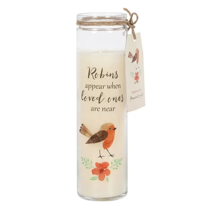This elegant memorial candle features a heartfelt message: “Robins appear when loved ones are near,” symbolising comfort, remembrance, and the presence of those we hold dearly. The tall glass vessel showcases a sweet illustrated robin and floral accents, creating a gentle, uplifting design perfect for honouring loved ones. Infused with a warm cranberry scent, it brings both light and soothing fragrance to any space. Ideal for memorial displays, peaceful reflection, or gifting to someone in need of comfort.