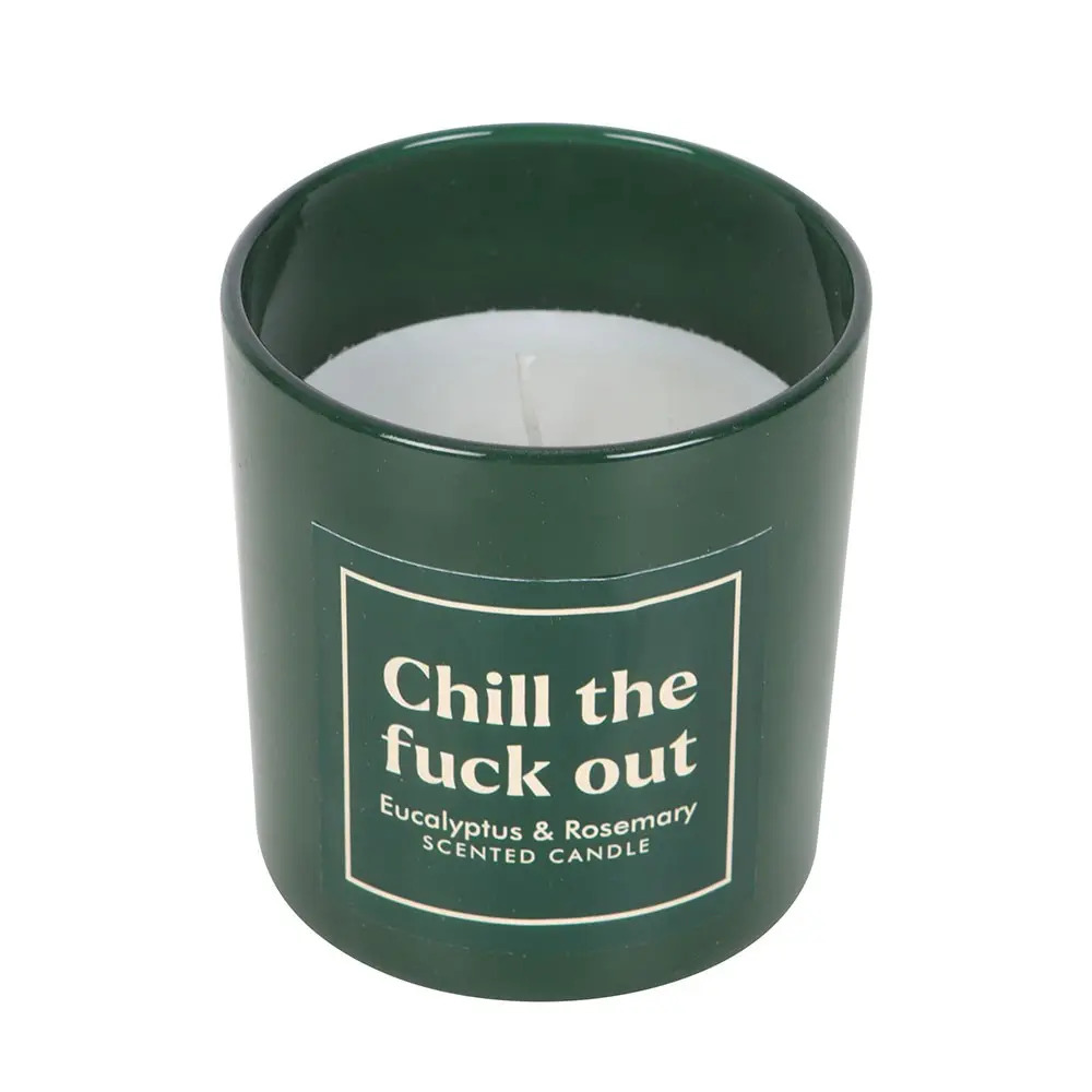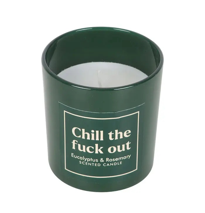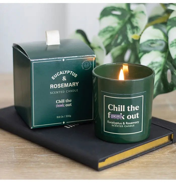 This bold eucalyptus and rosemary scented candle is designed to help you unwind with attitude. Poured into a deep green glass jar, it delivers a refreshing herbal aroma that clears the mind and creates a calm, grounded atmosphere. The matching box features the same cheeky “Chill the f*** out” message (censored on packaging), making it a fun yet functional gift for anyone who needs a moment of calm—or a gentle reminder to relax. Perfect for stress relief, self-care routines, or adding a modern, humorous touch to your space.
