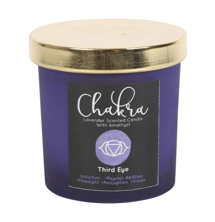 This beautiful Third Eye Chakra candle is crafted to support intuition, clarity and inner vision. The deep purple glass jar is filled with a soothing lavender-scented wax, perfect for meditation or relaxation. The top is adorned with genuine amethyst crystal chips, known for enhancing spiritual awareness and intuition. Designed with the Third Eye symbol on the label, this candle is ideal for chakra work, mindfulness rituals, or creating a peaceful and insightful atmosphere in any room.