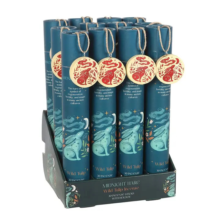 The Midnight Hare Wild Tulip Incense offers a beautifully crafted aromatherapy experience inspired by folklore and nature. Each tube contains 30 premium incense sticks paired with a holder, making it perfect for gifting or personal use. The fragrance of wild tulip delivers a soft, floral aroma that promotes relaxation, grounding, and emotional balance. Featuring artwork of the mystical hare—an ancient symbol of fertility, regeneration, and magic—this incense set is ideal for meditation, spiritual spaces, or enhancing the ambience of your home.