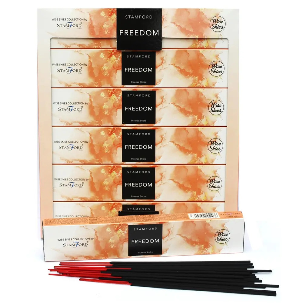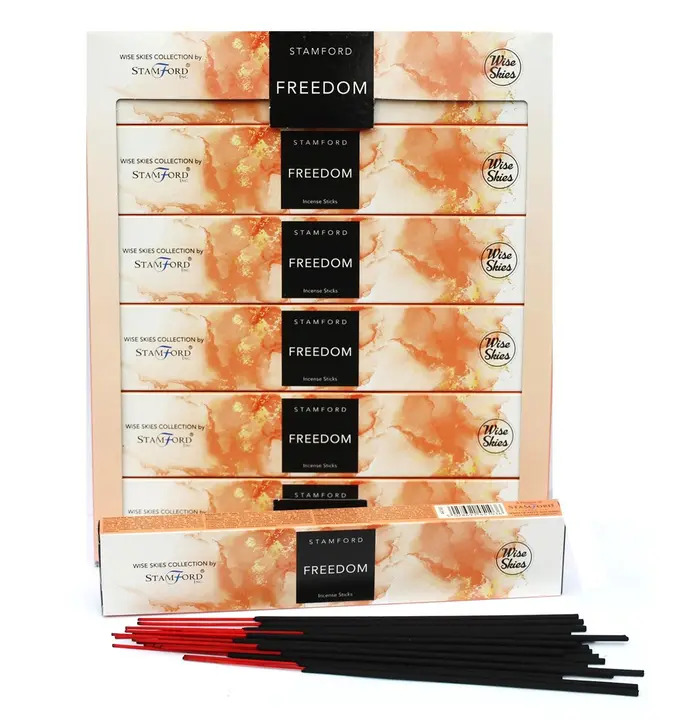 Wise Skies Freedom  is a dipped incense which are the most popular and recognisable type of incense. Dipped incense are made from bamboo but they are unscented sticks which are dipped into fragrance oil or essential oil and left to dry to create the finished product. Simply light the tip of your Incense Stick and wait for it to glow. Then blow out the flame and place in an incense holder for beautiful fragrance throughout your home.