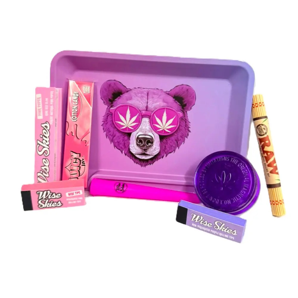 This blue and pink bear–themed smoking set is a vibrant, coordinated rolling kit designed for both style and everyday practicality. The set includes a high-quality double-sided rolling tray, offering two usable surfaces for convenient rolling and organisation. Paired with flavoured rolling papers, matching rolling tips, a grinder, and other accessories, everything is neatly matched for a smooth and enjoyable experience. Perfect for personal use or as a standout gift, this set combines bold artwork, colour consistency, and functional design in one complete package.