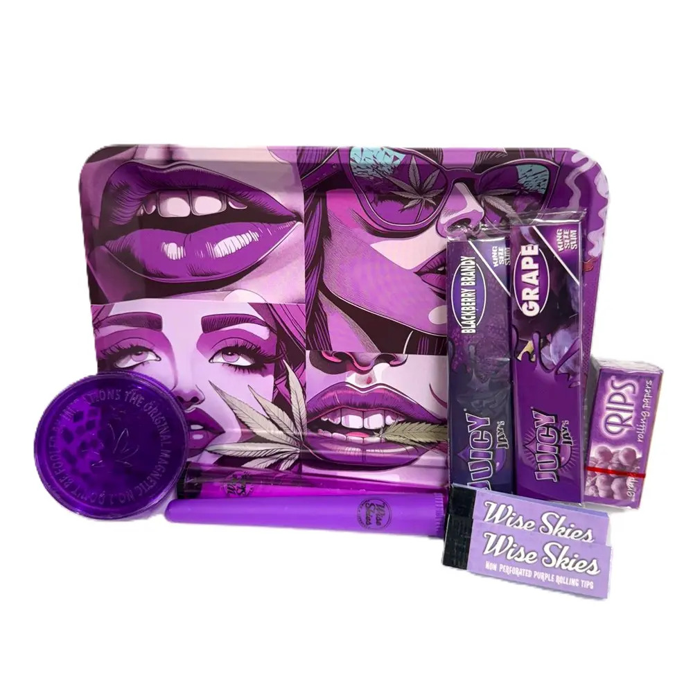 This purple pop-art smoking set is a striking, all-in-one rolling kit designed for smokers who appreciate bold visuals and everyday practicality. The set includes a high-quality double-sided rolling tray, offering two usable surfaces for easy rolling and organisation. Featuring grape and blackberry flavoured papers, purple rolling tips, a grinder, and other coordinated accessories, everything is colour-matched for a clean and cohesive setup. Ideal for personal use or as a standout gift, this set combines eye-catching artwork with functional design for a smooth and stylish rolling experience.