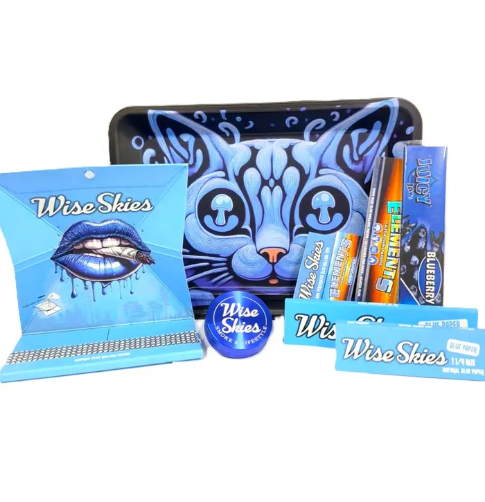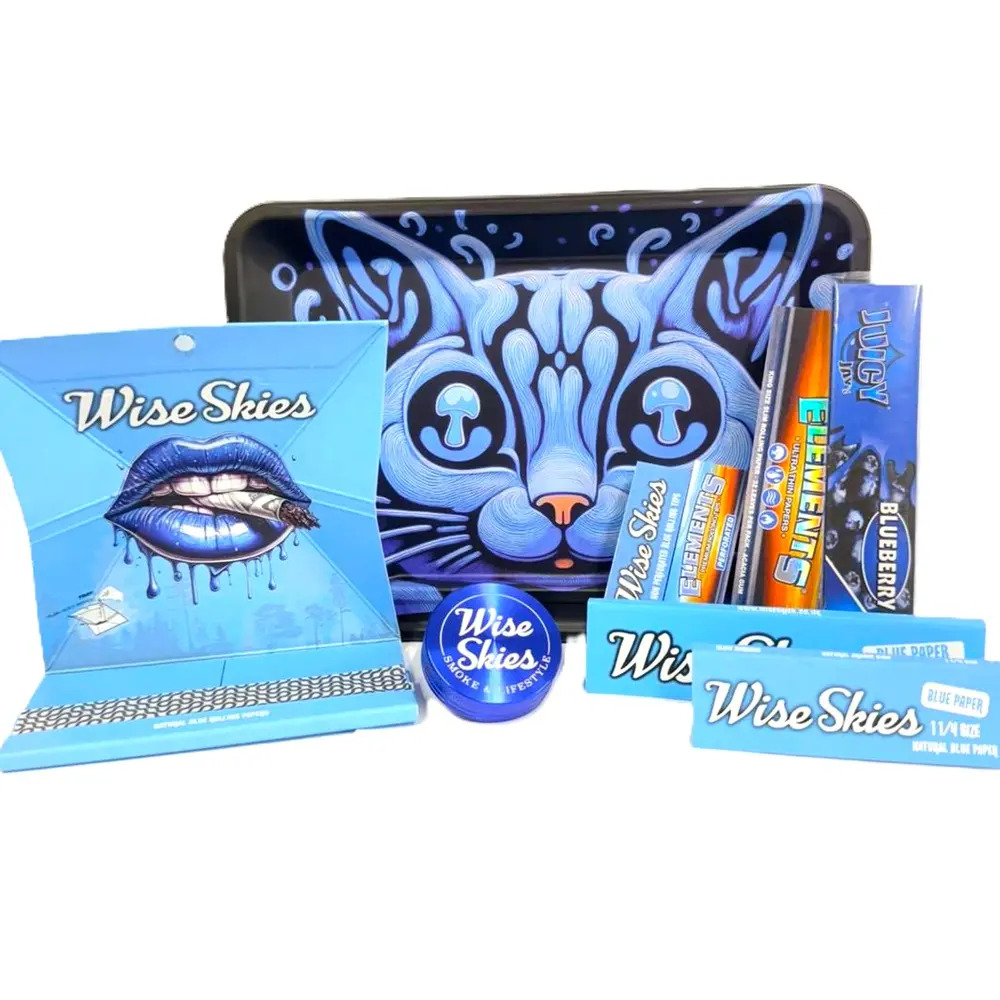 This blue-themed Wise Skies smoking set is a bold, coordinated rolling kit designed for smooth sessions and standout style. The set includes a high-quality double-sided rolling tray, providing two designs. Paired blue rolling papers, rolling tips, a grinder, and matching accessories, everything is carefully colour-matched for a clean and cohesive setup. Ideal for everyday use or as a premium gift, this all-in-one set combines eye-catching artwork with practical functionality for an elevated rolling experience.