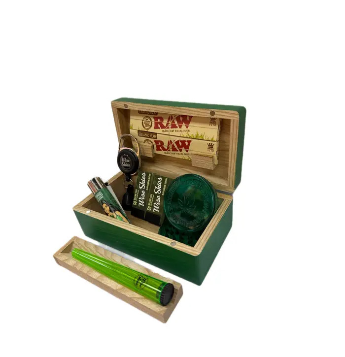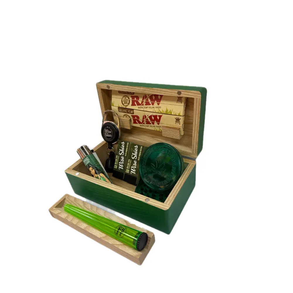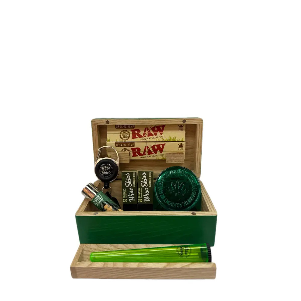 The Wise Skies Green Rolling Box Set is a high-quality, all-in-one smoking accessory kit designed for convenience, organisation, and style. Crafted from durable wood with a sleek green finish, this box offers secure storage for your rolling essentials and a clean, organised setup whether at home or on the go. The interior is thoughtfully laid out to keep everything in place, making it ideal for beginners and experienced smokers alike. Its compact size allows for discreet storage, while the accessories included provide a complete rolling experience straight out of the box.