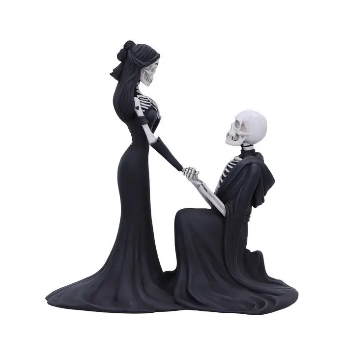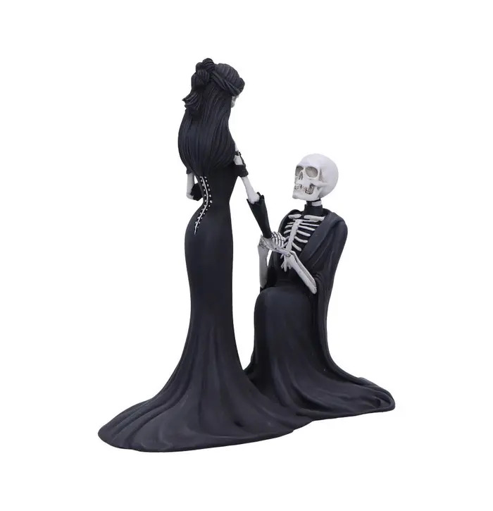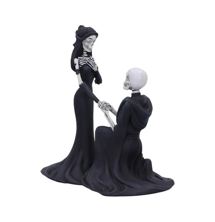 The Eternal Proposal Skeleton Figurine 23cm tells a hauntingly beautiful love story, capturing the moment an eternal bond is sealed with a skeletal proposal. Standing tall in a flowing black gown, the skeletal bride-to-be gazes lovingly at her kneeling partner, their bony hands clasped in devotion. Crafted from high-quality resin with intricate bone detailing and dramatic gothic styling, this striking figurine embodies a romance that transcends life itself. Perfect for gothic weddings, alternative décor, or collectors who appreciate macabre elegance, this 23cm piece adds a touch of dark enchantment to any space.