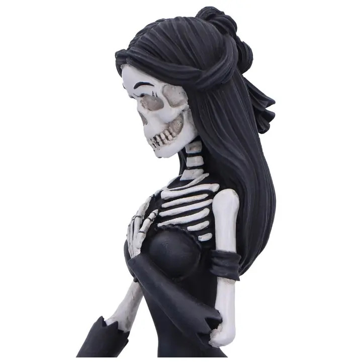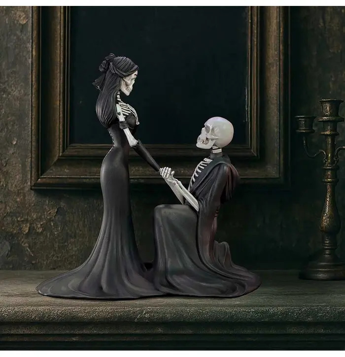 • Intricately sculpted details, matte black flowing robes, and a tender scene that blends macabre charm with romantic sentiment.