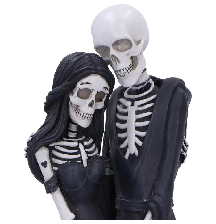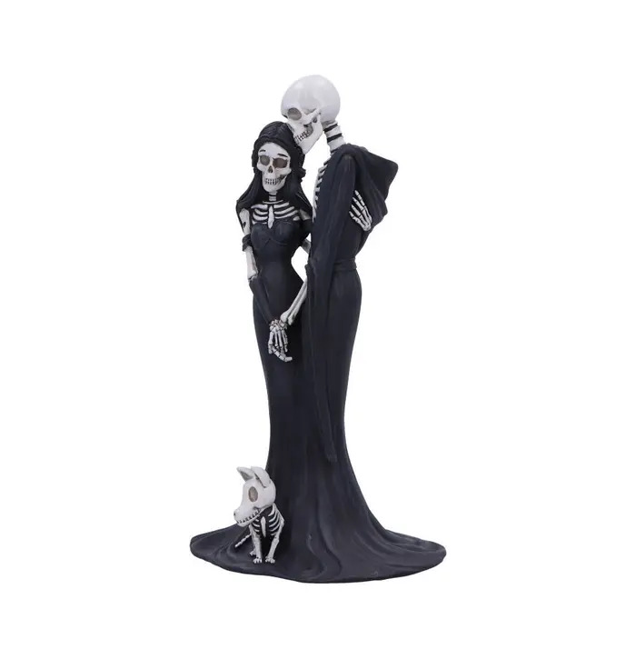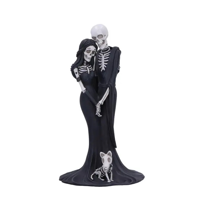 • Gothic-inspired figurine symbolising everlasting love featuring two skeleton lovers locked in an embrace, along with a skeleton dog companion.