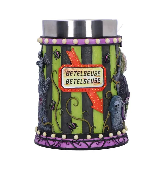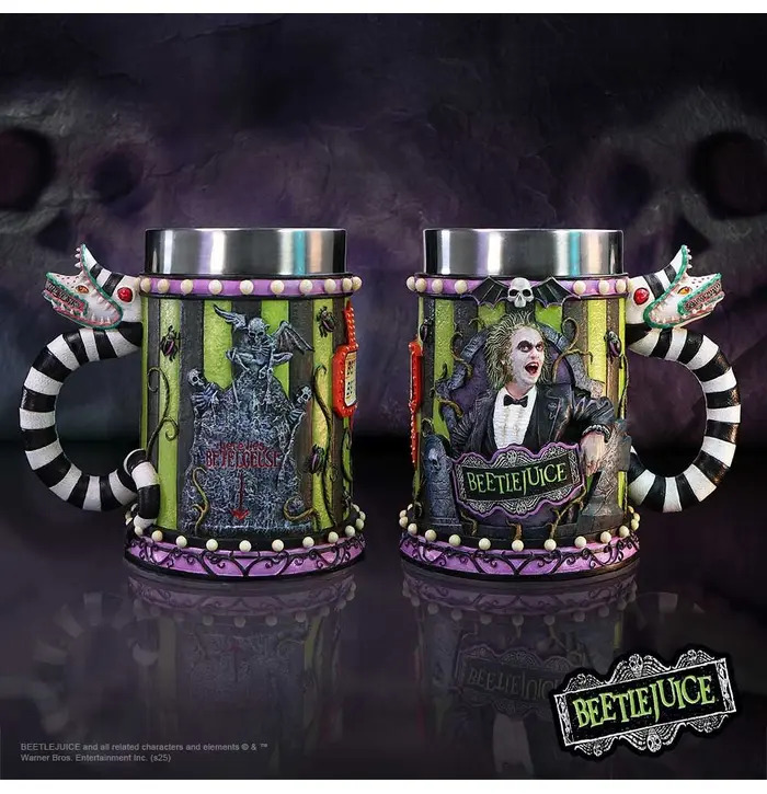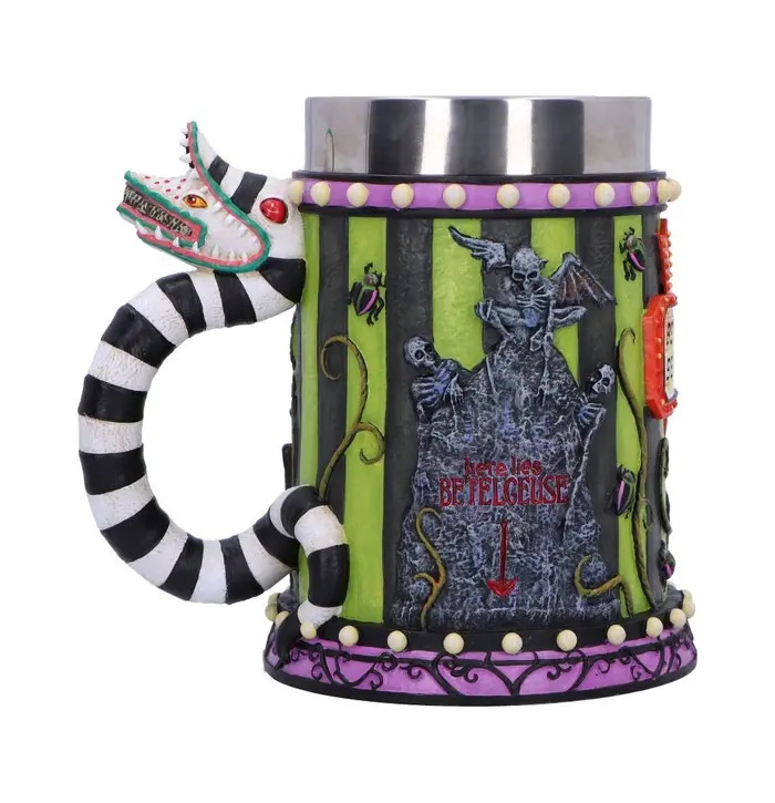 • The tankard features a sculpted handle resembling the two-headed sandworm, bold black and green stripes, and the mischievous portrait of Beetlejuice himself on one side.