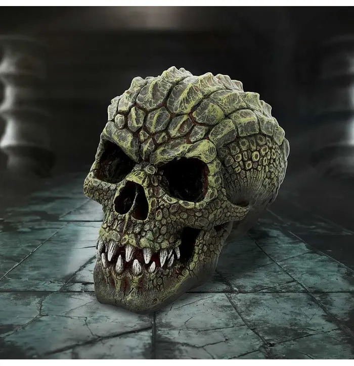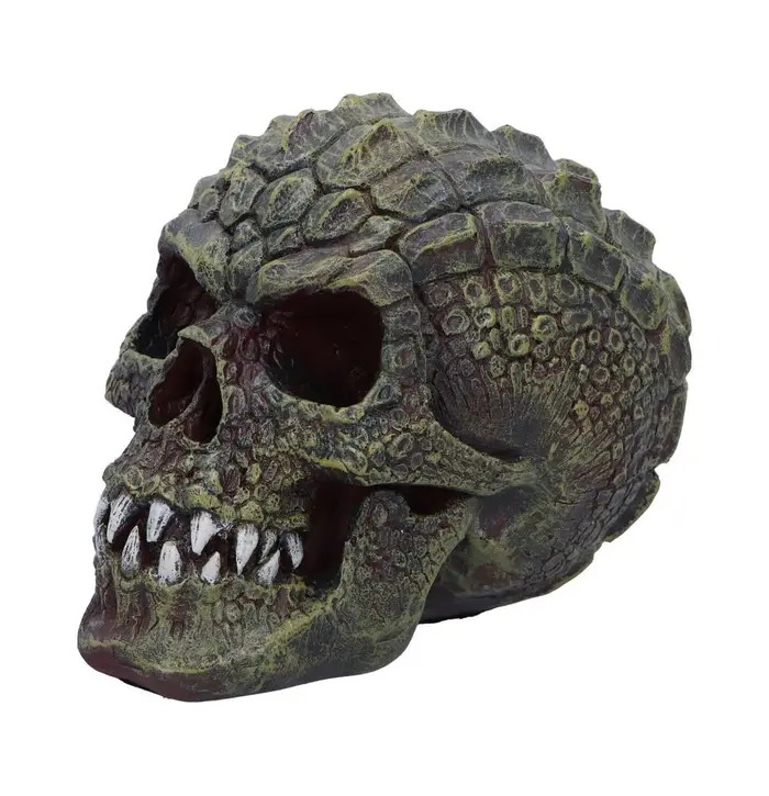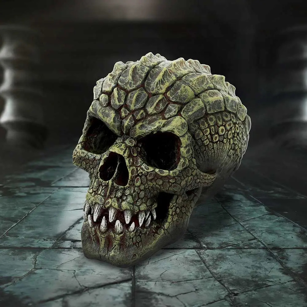 Unleash the mystique of the fantastical with our Reptillian Skull, from Nemesis Now's premium collection, a 17cm masterpiece that seamlessly melds the elegance of a human skull with the allure of a scaled creature. Crafted from high-quality resin, this unique piece features sharp fangs and spiked scales rising from the top, creating a captivating blend of human and reptilian aesthetics. The skull is adorned with intricate green scales, adding a touch of mythical charm. Meticulously painted in vibrant green with nuanced black highlights, the Reptillian Skull stands as a testament to the imaginative fusion of the natural and supernatural. Perfect for those who appreciate the enigmatic beauty of fantasy, this piece is a striking addition to any collection. Explore our diverse range of skulls, each crafted to intrigue and captivate enthusiasts of the extraordinary.