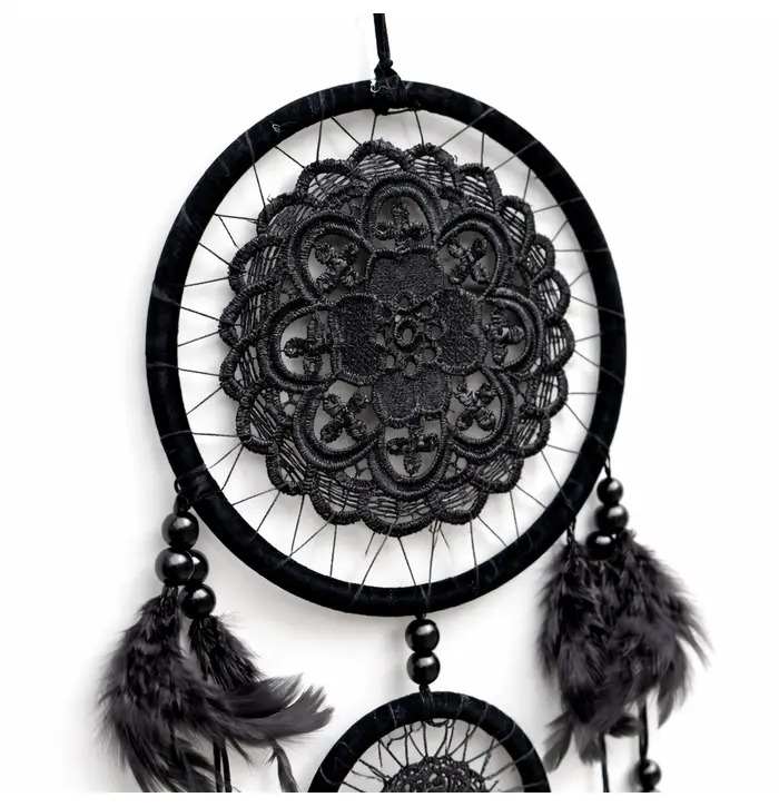 Dreamcatchers are traditionally believed to protect against negative energy while allowing positive dreams to pass through. The deep black colour adds a modern, mysterious aesthetic, making it ideal for bedrooms, living rooms, meditation areas, or alternative home decor styles.