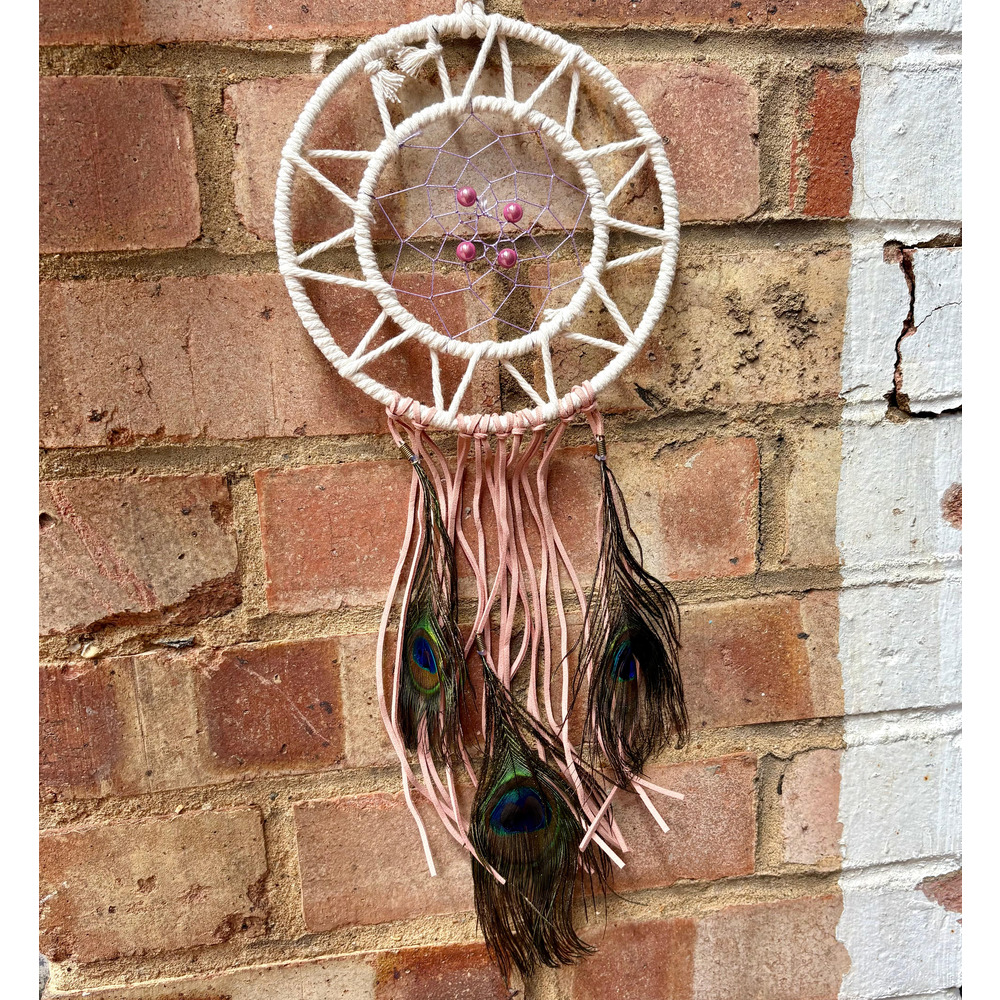 This beautiful white dream catcher with peacock feathers is a must have in your home. Whether you are struggling with bad dreams or you want a gorgeous decoration to hang in your home, this will do just the trick! Providing a nice aesthetic no matter where it is, our dream catchers will provide protection while you sleep.