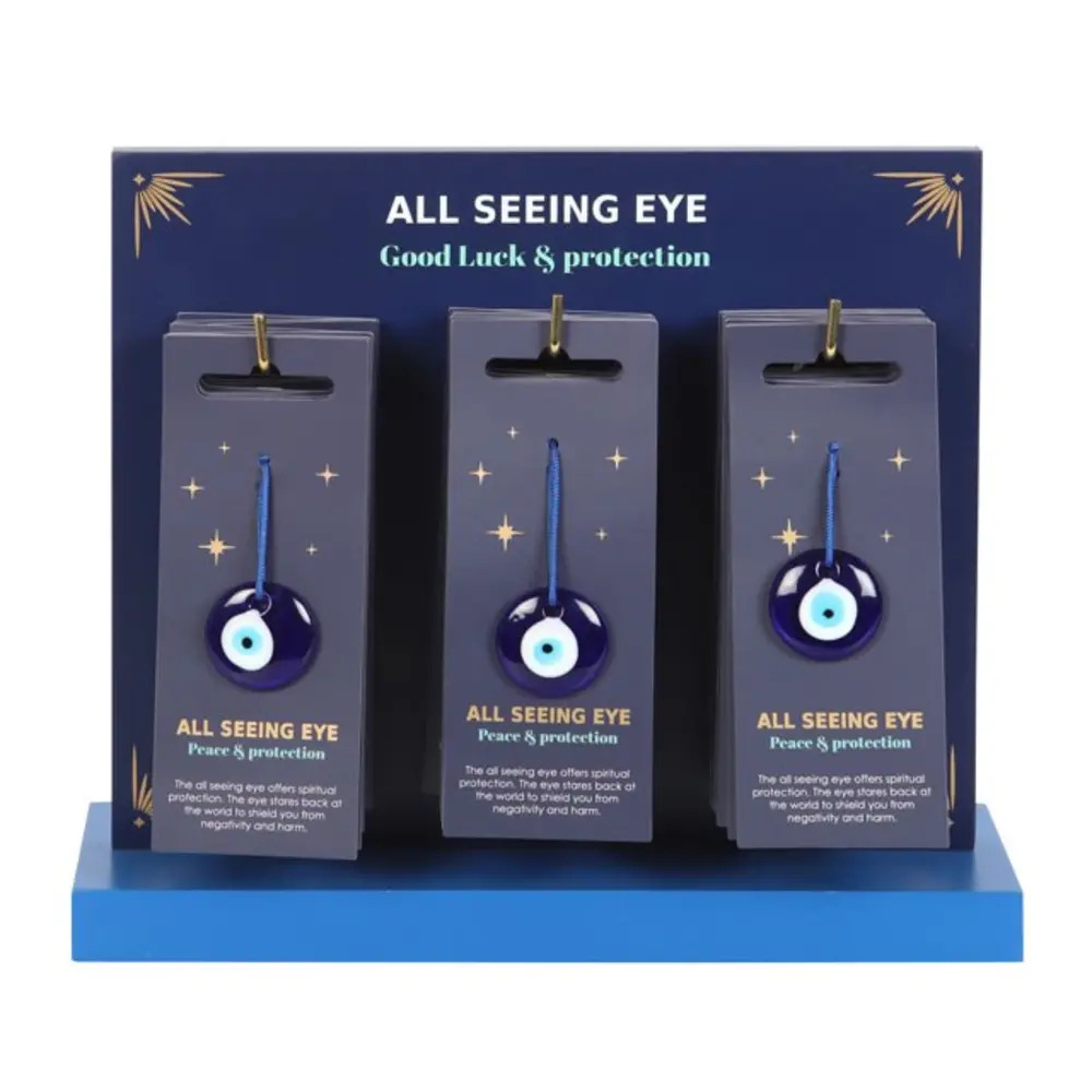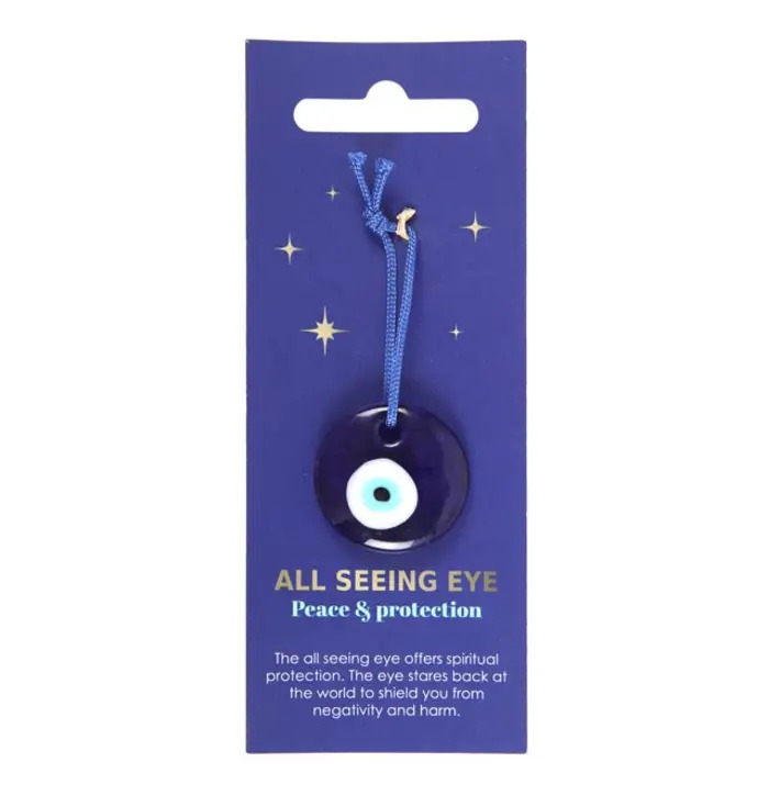 This All Seeing Eye charm is designed as a symbol of peace, protection, and spiritual safeguarding. Featuring a classic blue evil eye motif, it comes attached to a durable cord for easy hanging in your home, workspace, car, or personal sacred space. Traditionally believed to ward off negativity and harmful intentions, this charm offers a meaningful reminder of inner calm and energetic protection. Compact and lightweight, it makes an ideal gift for anyone seeking balance, mindfulness, or a touch of symbolic décor.