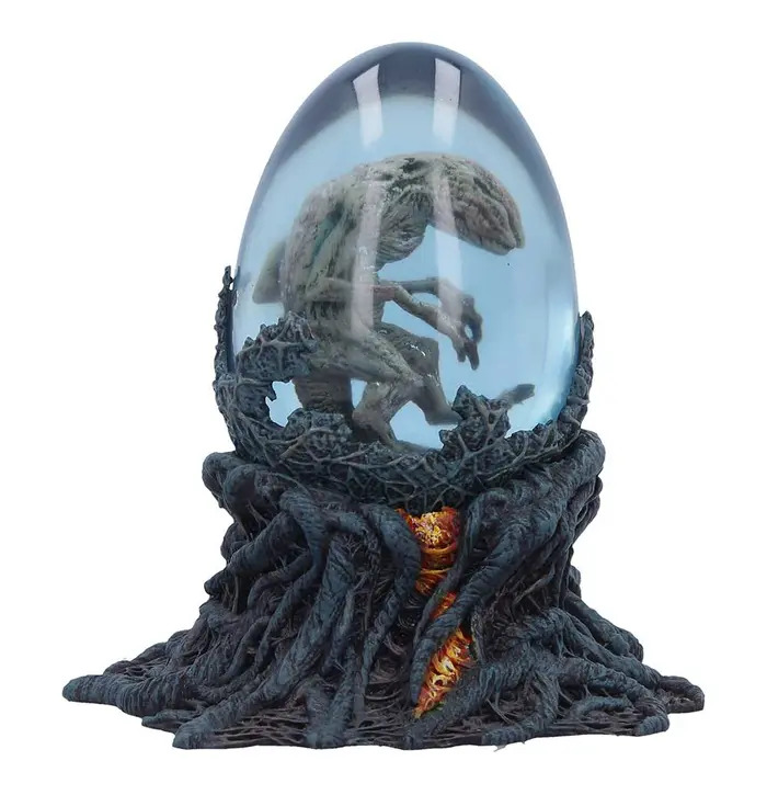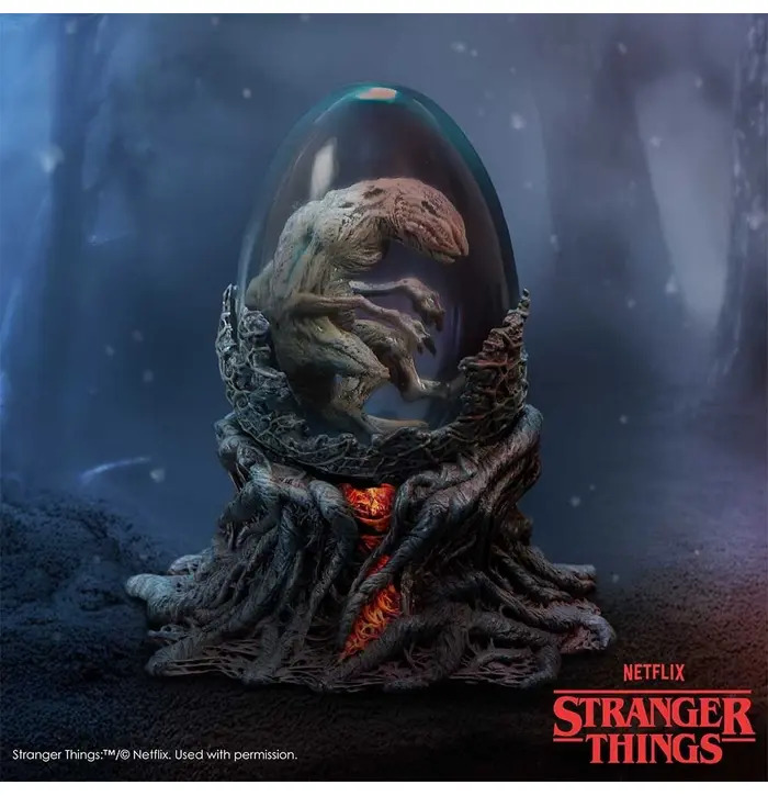 Enter the Upside Down with this officially licensed Stranger Things Demodog Box. Standing at 16cm, this eerie trinket box features a Demodog encased in a glass-like egg filled with blue liquid, resting on a twisted base wrapped in detailed tentacle vines. Lift the egg and base to reveal a fiery red interior and the Stranger Things logo, representing the Gate from season 2. Cast in resin and expertly hand-painted, it's perfect for storing small keepsakes or displaying as part of a collection. Packaged in a full-colour branded gift box, this collectible is ideal for fans of the series, horror lovers, and anyone looking to bring a bold piece of Hawkins into their space.
