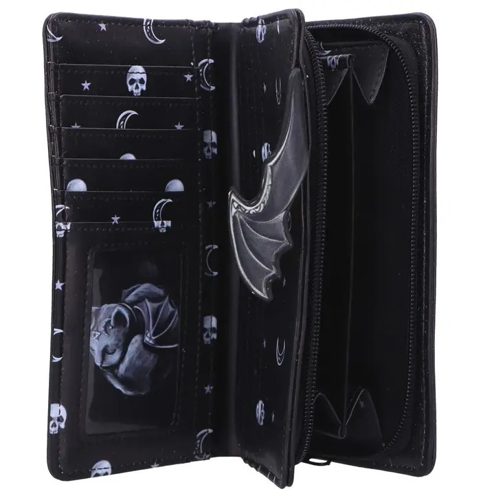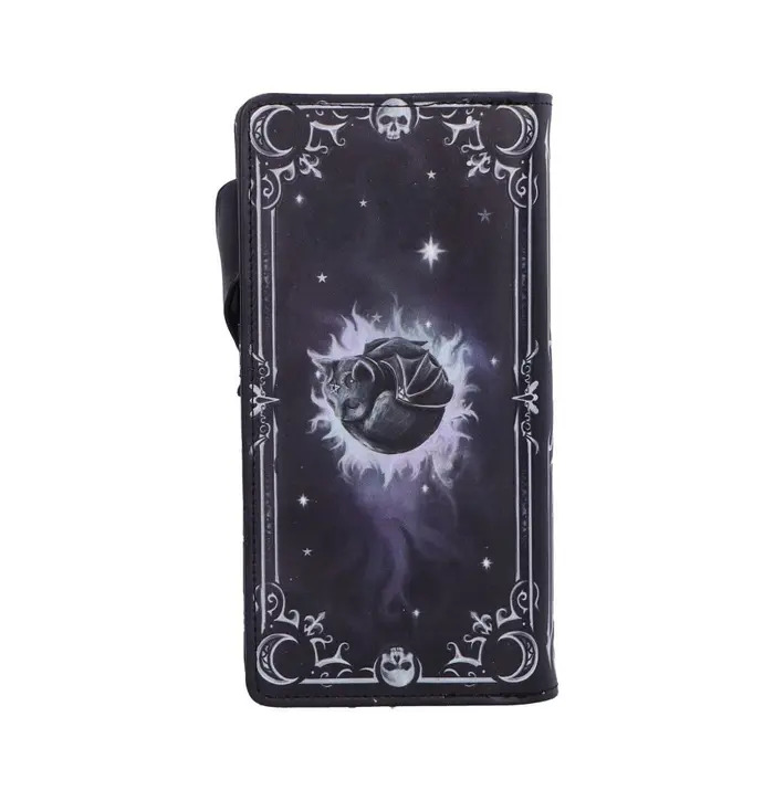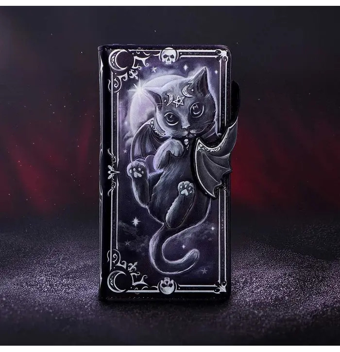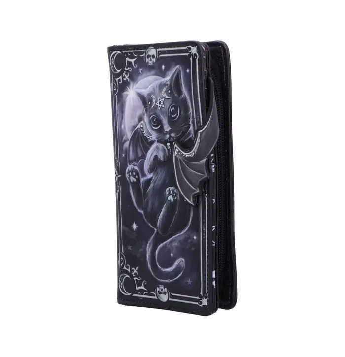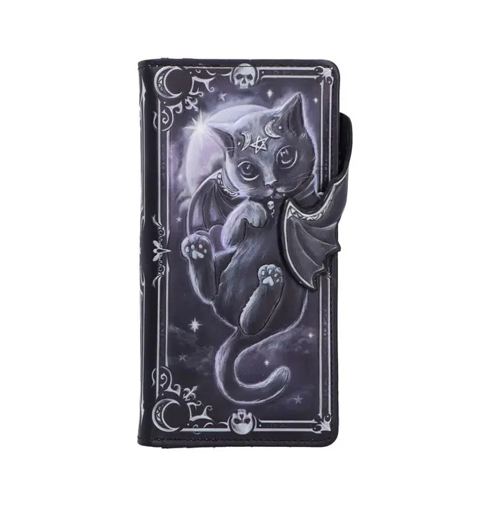 The Moon of Malpuss Embossed Purse is a gothic-chic accessory featuring Nemesis Now's original Malpuss character from the popular Cult Cuties range. Made from durable leather, it showcases intricately embossed artwork with crescent moon motifs and a vampiric feline design, complete with a zip-around closure and compartments for cards and coins. Packaged in a protective polybag branding, it's ideal for gifting or collecting. Perfect for fans of gothic fashion and quirky, cute accessories, this purse brings a touch of spooky charm to your everyday essentials.