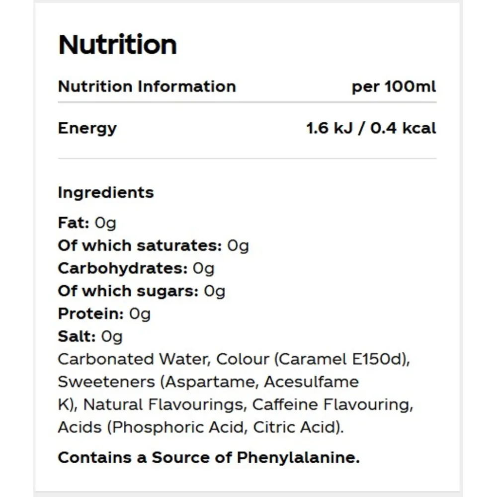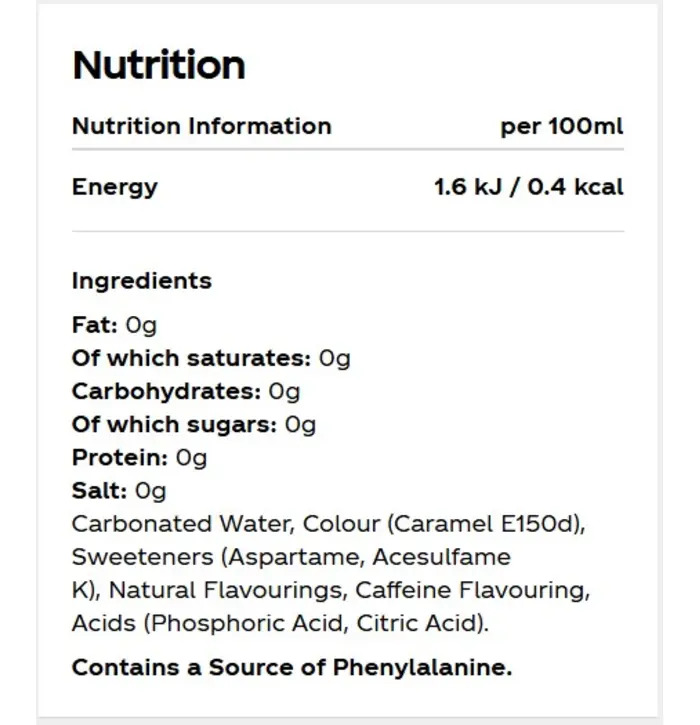 Carbonated Water, Colour (Caramel E150d), Sweeteners (Aspartame, Acesulfame K), Natural Flavourings, Caffeine Flavouring, Acids (Phosphoric Acid, Citric Acid)