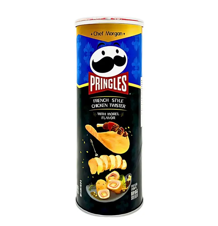Pringles French Style Chicken Twister (80g, China) features a savory, roasted chicken flavor with hints of mushroom, onion, and garlic. Ingredients include Dehydrated Potatoes, Vegetable Oil (Palm, Corn, and/or Sunflower), Corn Flour, Wheat Starch, Rice Flour.Sugar, Salt, Chicken Powder/Flavor, Morel Mushroom Powder, Maltodextrin, Yeast Extract, Onion Powder, Garlic Powder Monosodium Glutamate (E621), Disodium 5'-ribonucleotide (E635). Emulsifier (E471), Acidity Regulators (Citric Acid E330, Sodium Carbonate E500) Contains Wheat (Gluten), Soy, and Milk (Whey Powder).