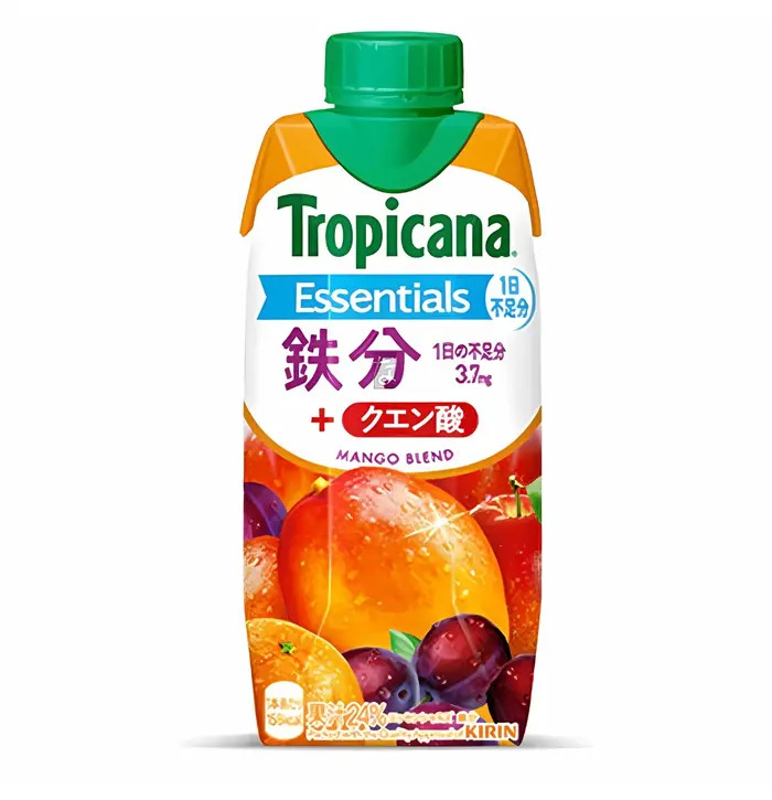Tropicana Essentials Plus Mango Blend (330ml, Japan) is a nutrient-focused fruit drink, typically featuring a blend of mango, prune, and other fruit juices designed for functional, on-the-go nutrition. It often highlights added iron and citric acid for daily dietary support.