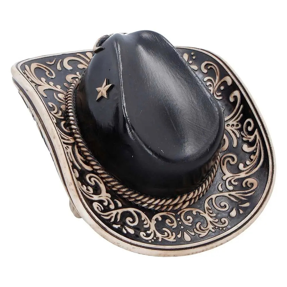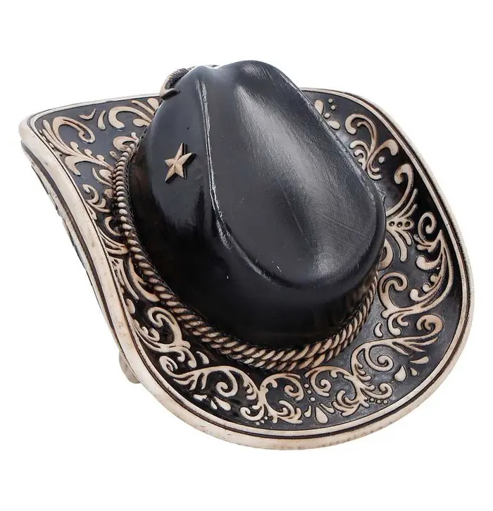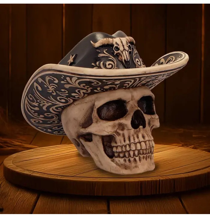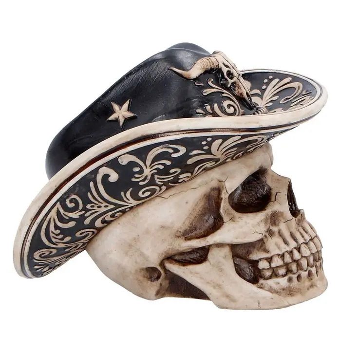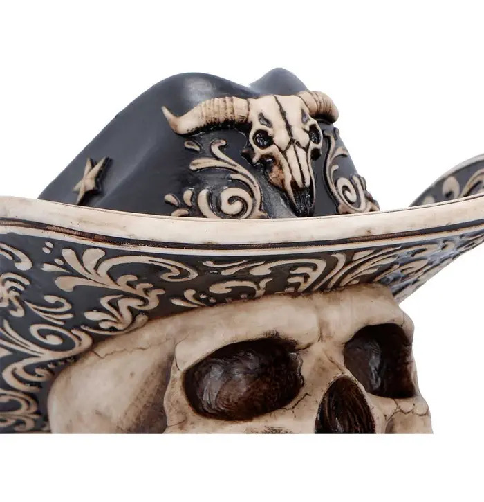The Wild West Figurine is a bold statement piece that captures the rugged spirit of the frontier. Featuring a realistic skull with detailed bone textures and a Western-style cowboy hat adorned with a miniature bull skull, this figurine boasts intricate craftsmanship and bone-like colouring throughout. It comes securely packaged in a branded box, ready for gifting or display. Perfect for fans of Western culture, gothic decor, or unique collector's items, this striking skull adds a touch of outlaw attitude and frontier charm to any space.
