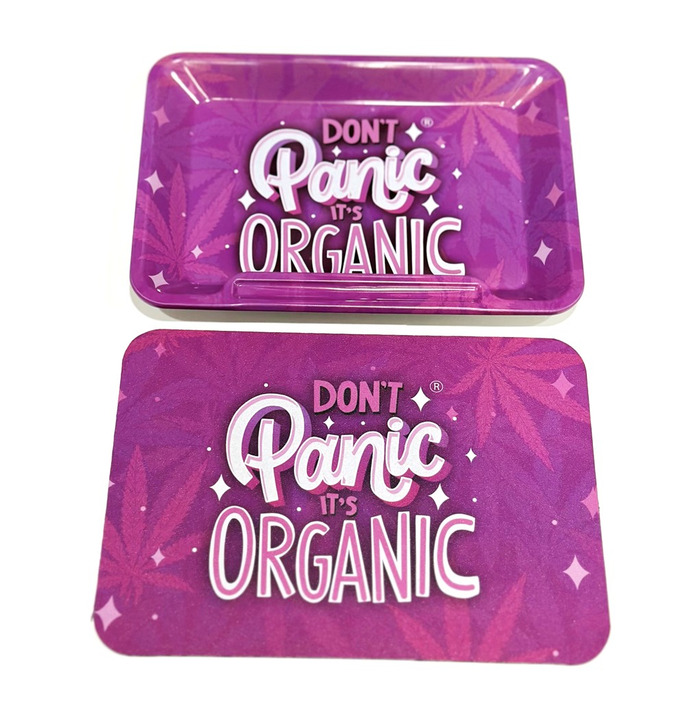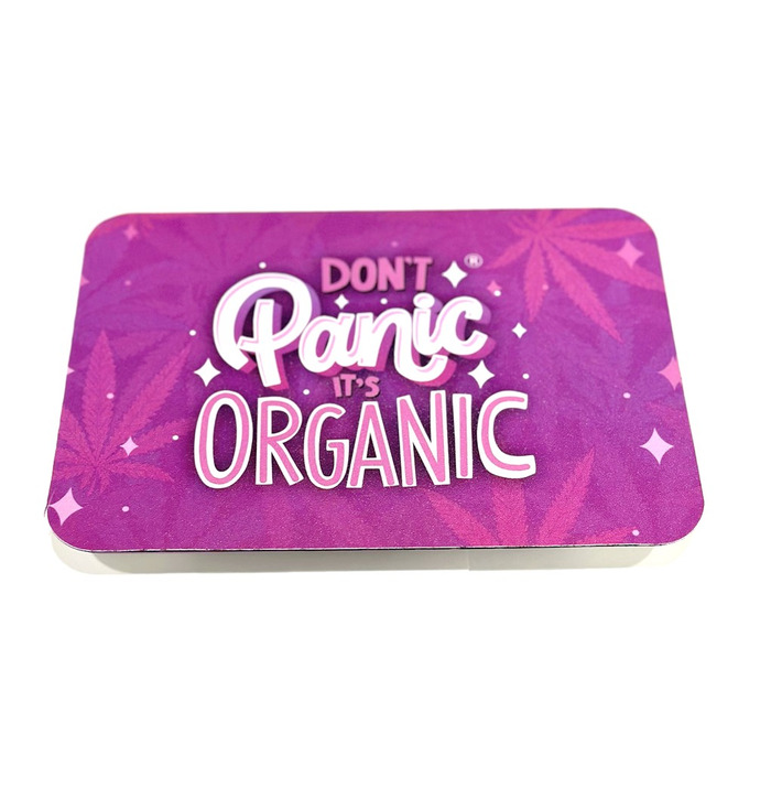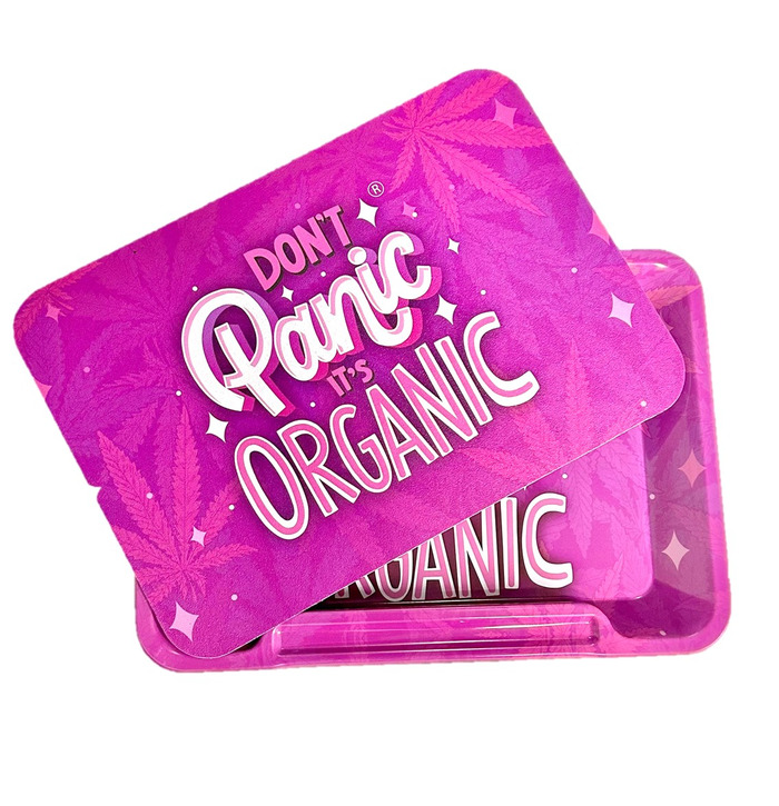 Don't Panic! Because now you can safely store your Rolling Accessories & Keep them all in one place with this Girly Magnetic Tray Cover! Featuring the iconic phrase, "Don't Panic, It's Organic" on the front of the cover, this bold phrase is surrounded by a subtle flurry of leaves within the bright pink background!