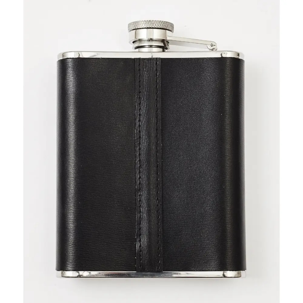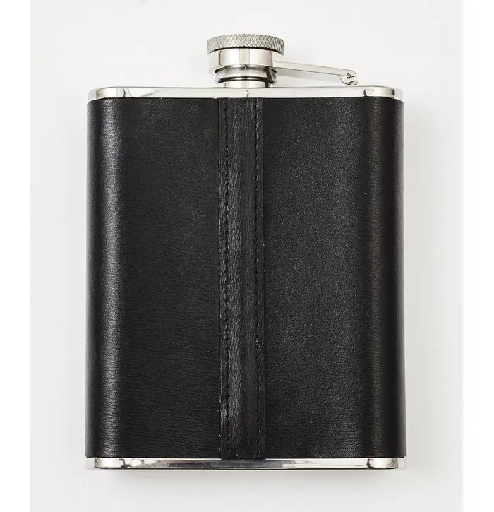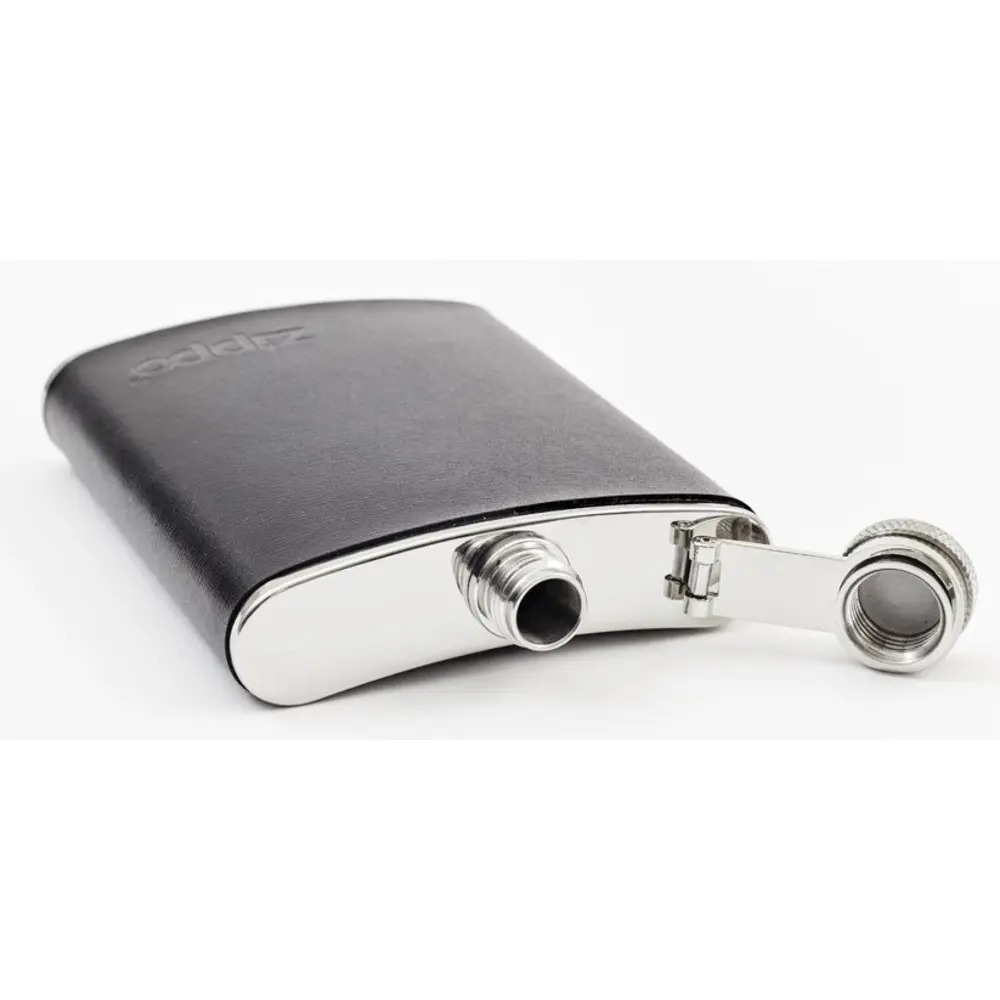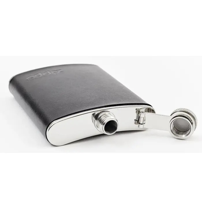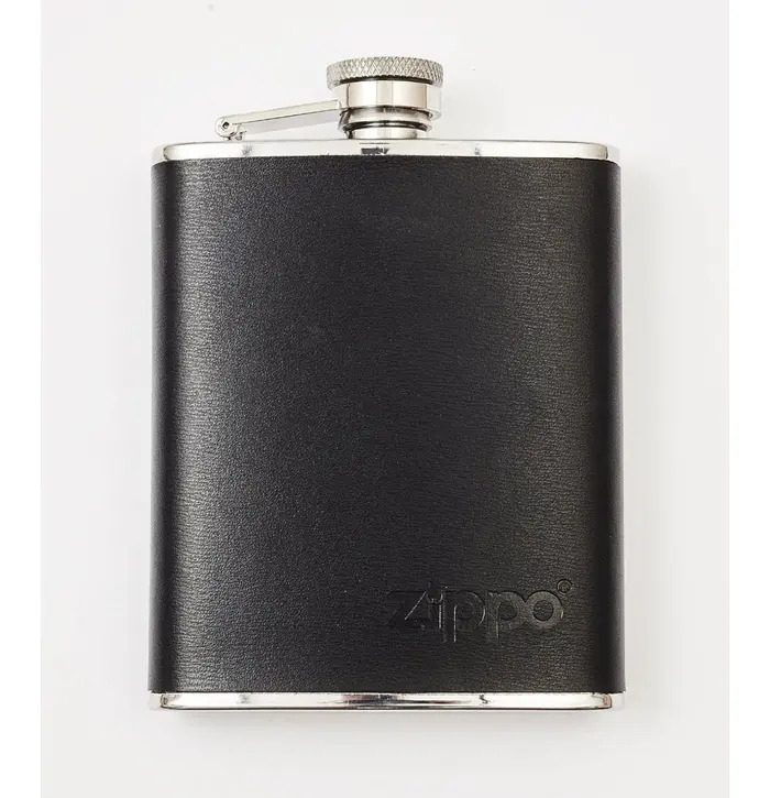 Zippo’s stainless steel flask makes an excellent groomsmen gift or gift for a friend. This black leather, stainless steel 6-ounce/177ml flask with the Zippo logo and secured lid has a slim, slightly curved shape for comfortable carrying.