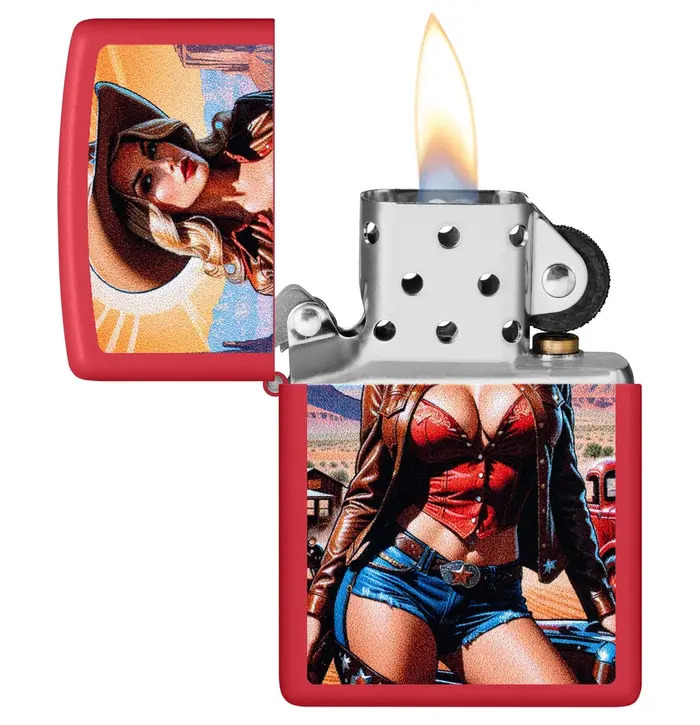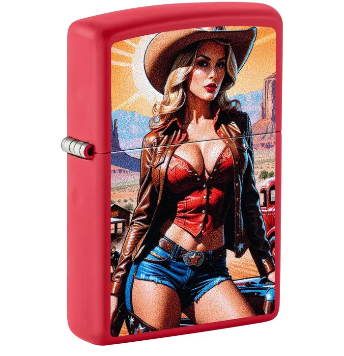 With a modern style of the iconic pinup art era, this classic red matte lighter features a stunning pinup cowgirl posing in front of a western desert backdrop in a vivid image of America's past.